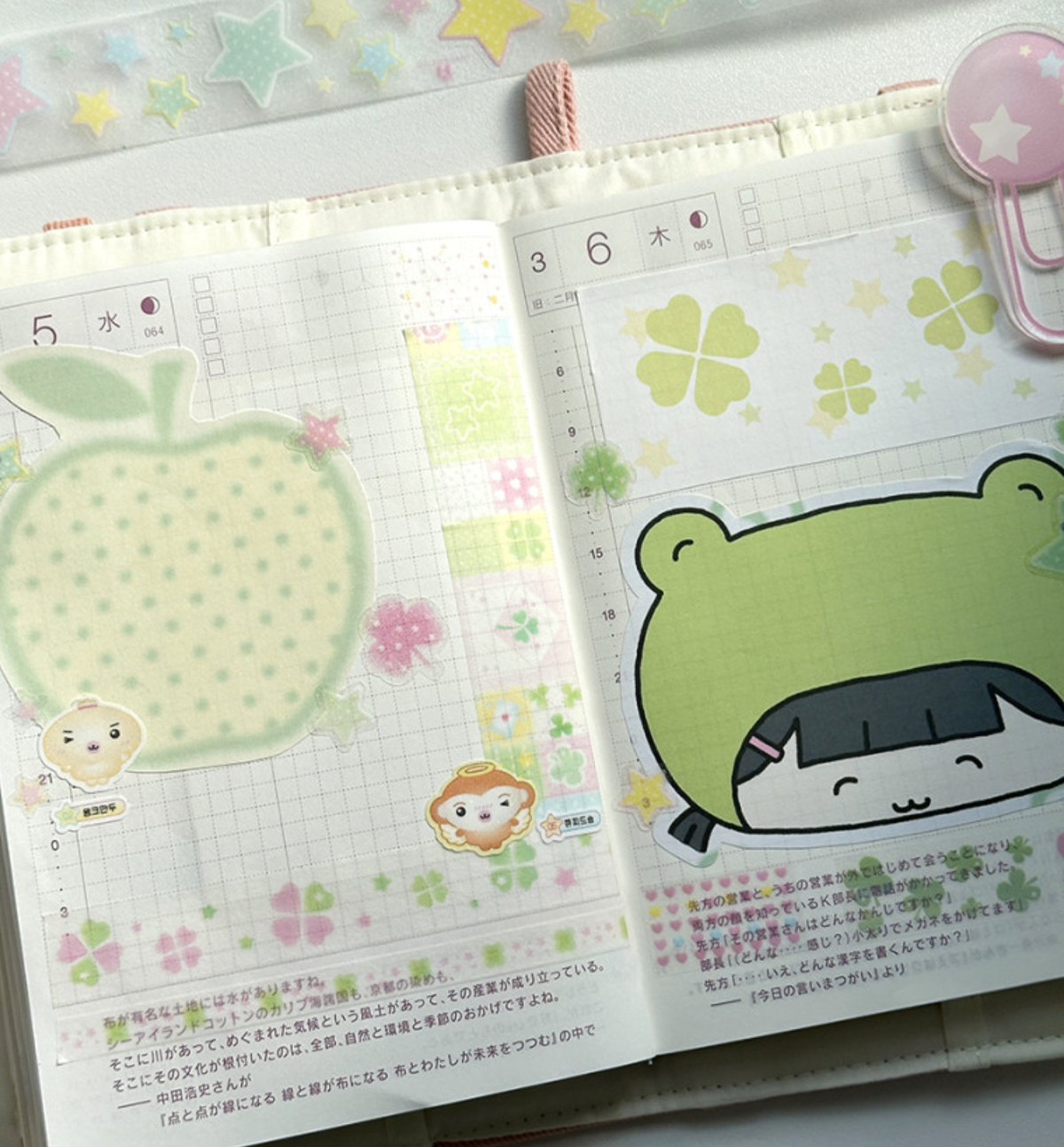 A versatile sticker set featuring layout elements and patterned designs with cute graphics. Perfect for diaries, scrapbooks, and DIY projects. Easy to write on, they add depth and charm to any page.