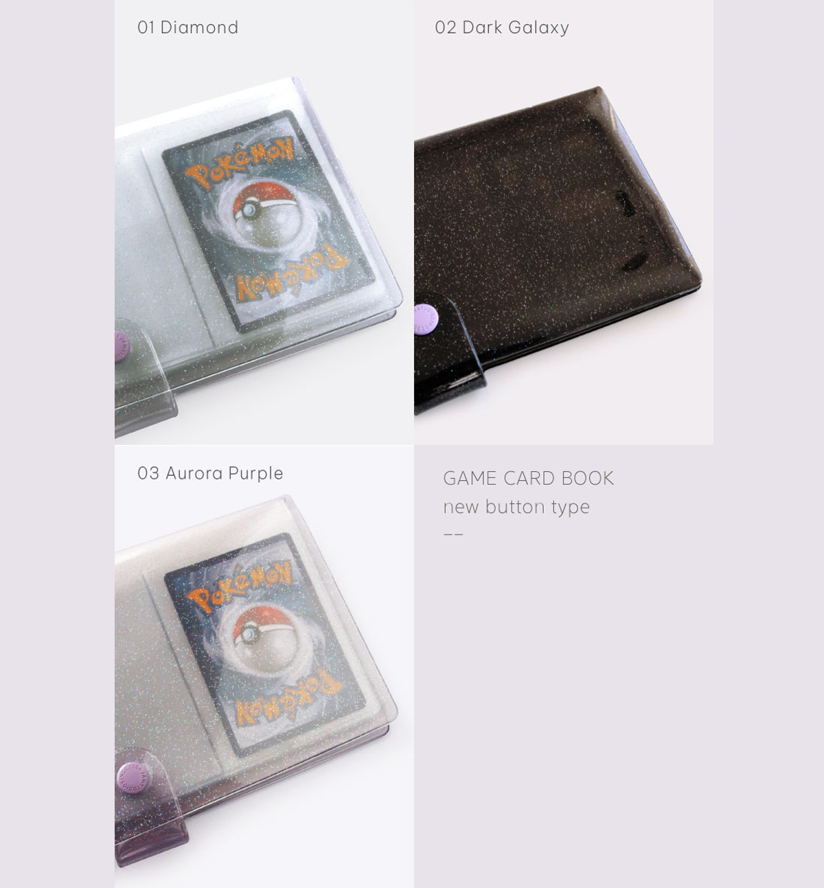 This beautiful Game Card Book Ver. 2 comes in 3 different colors: 01. Diamond, 02. Dark Galaxy and 03. Aurora Purple.