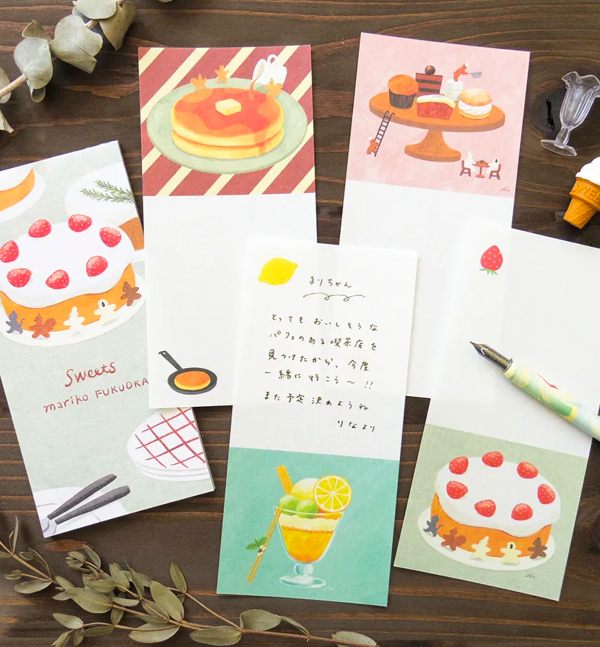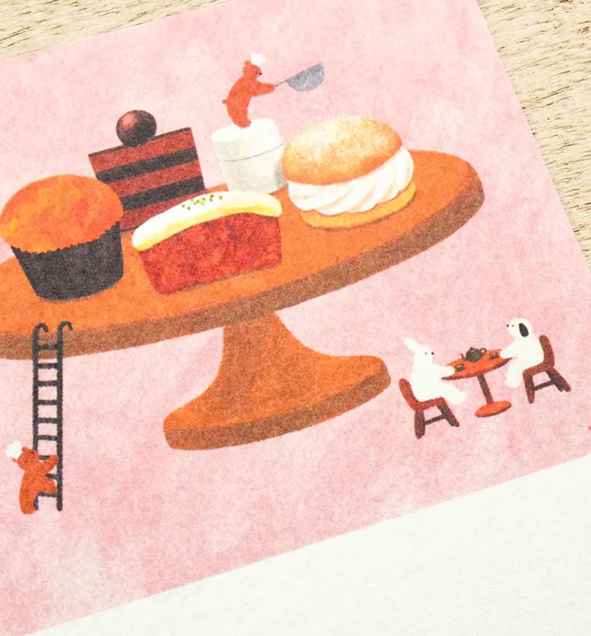 Designed by illustrator Mariko Fukuoka, this kawaii stationery piece features tiny animals carefully decorating delicious-looking sweets and desserts, creating heartwarming scenes that feel playful and comforting. Each page is designed to bring joy—perfect for both the writer and the recipient.