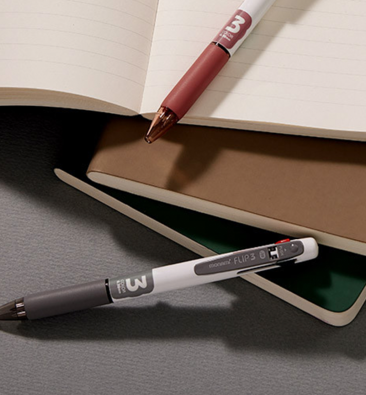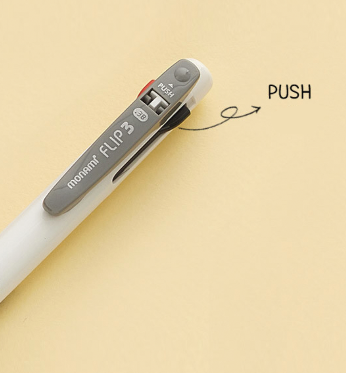 FLIP 3 Ball Pen 0.38mm has a delicate and detailed writing line. Multi-color ballpoint pen with 3 ink colors: Black, Blue and Red on one body. Low viscosity ink that provides a smooth writing feel. Easy to carry clip. Push Button on the clip that can automatically insert refill lead.