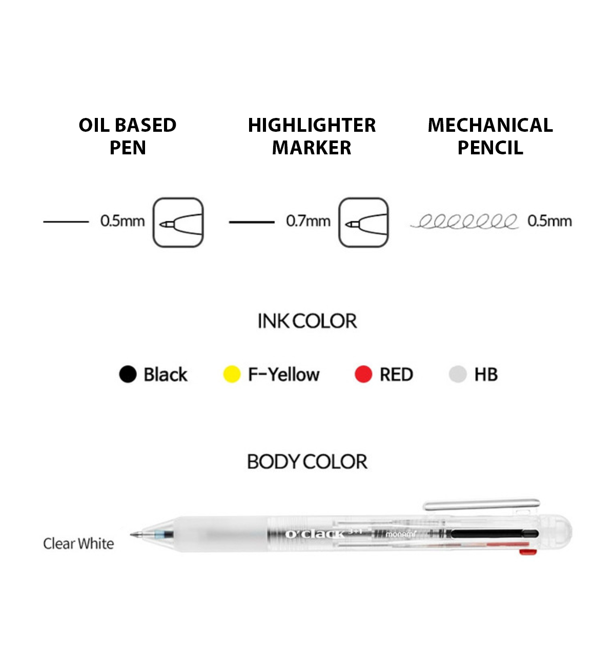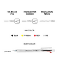 Body Color Clear White: 2 pen ink colors: Black and Red | Highlighter: Yellow | Mechanical Pen: HB