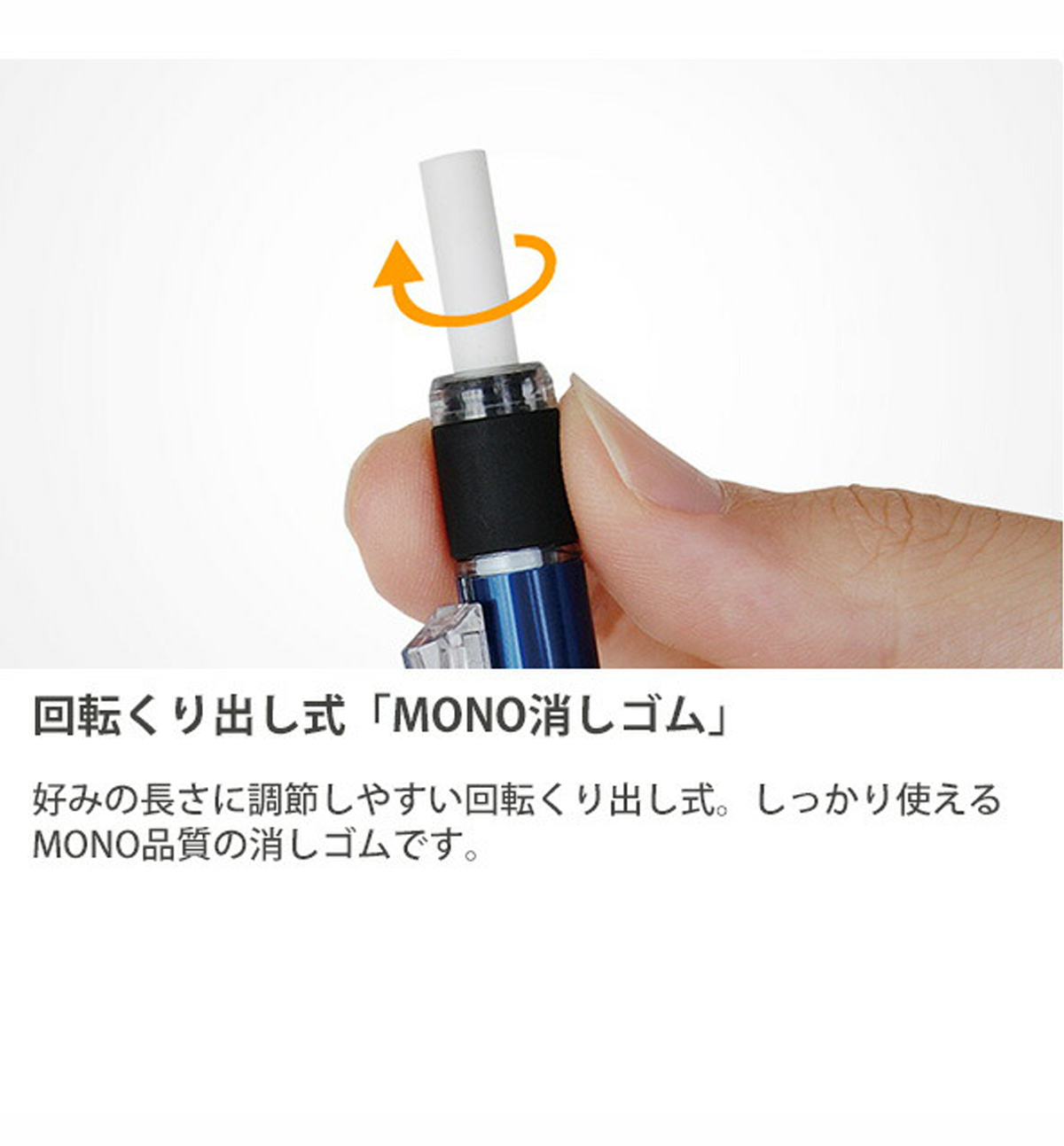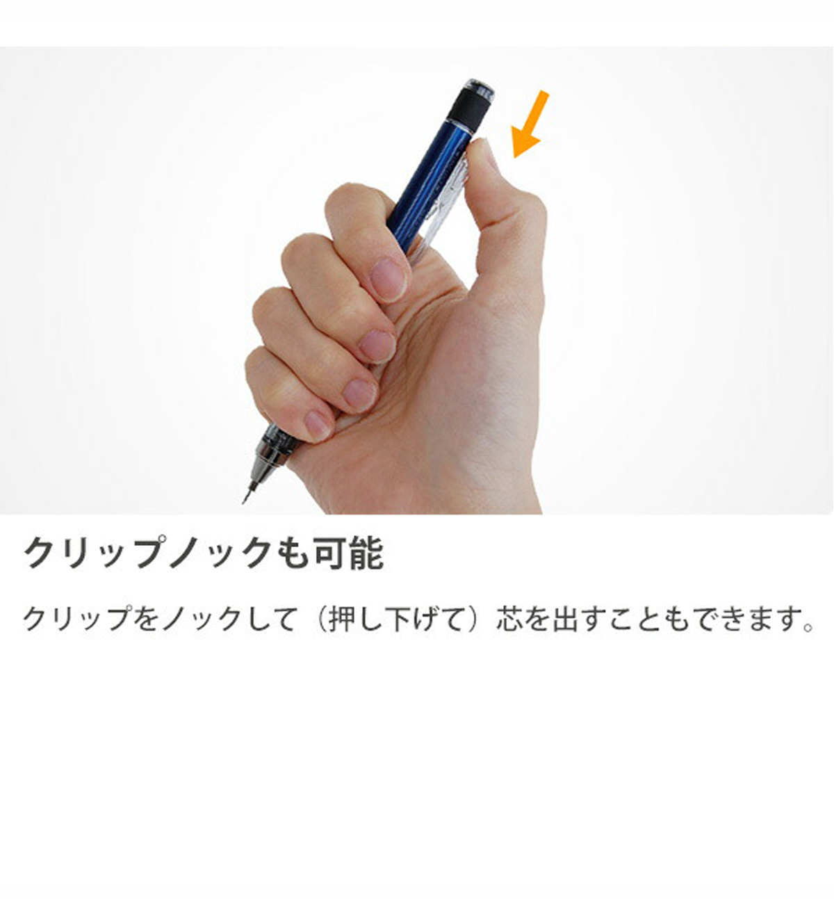 The pen tip is a fixed pipe type designed for drafting, which provides a wide field of view at the hand and allows for stable and precise writing. Shake to advance the lead (Fre-knock mechanism). Prevent accidental knocking (Fre-lock mechanism). Twist to advance the "Mono eraser".