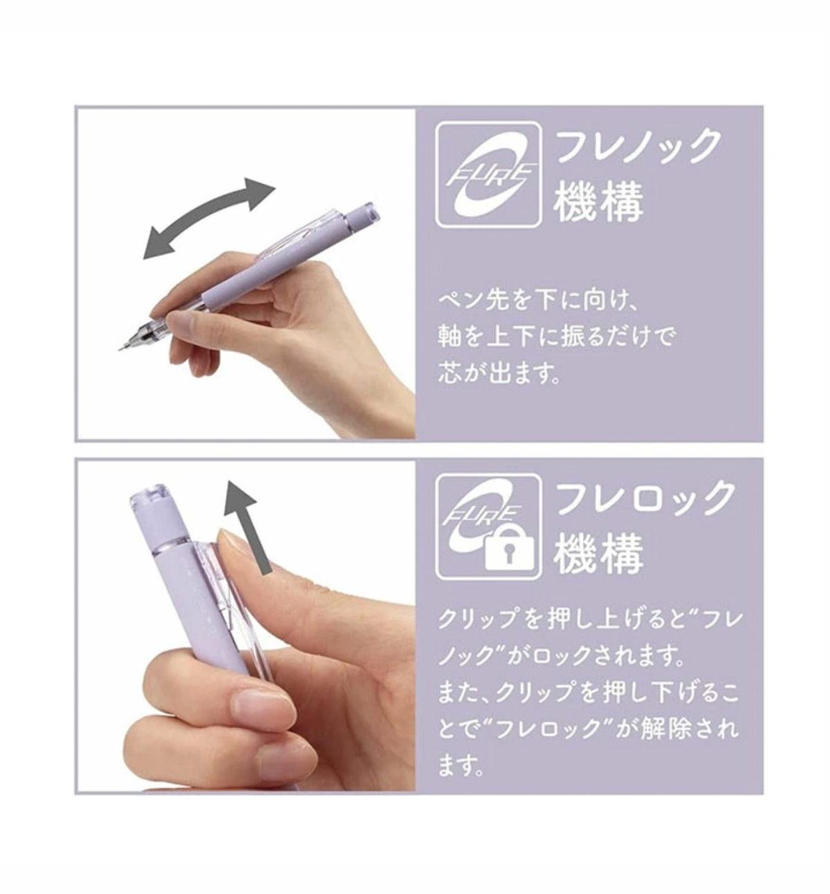The pen tip is a fixed pipe type designed for drafting, which provides a wide field of view at the hand and allows for stable and precise writing. Shake to advance the lead (Fre-knock mechanism). Prevent accidental knocking (Fre-lock mechanism). Twist to advance the "Mono eraser".