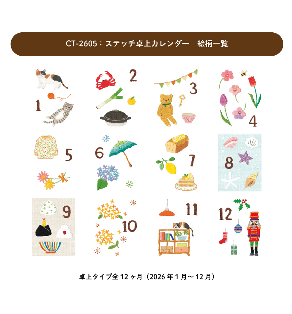 Add warmth and charm to your workspace with this 2026 Stitch Small Desktop Calendar, featuring beautifully detailed embroidery by Yoko Fujiki. Each month captures everyday life scenes with care and a cozy touch.