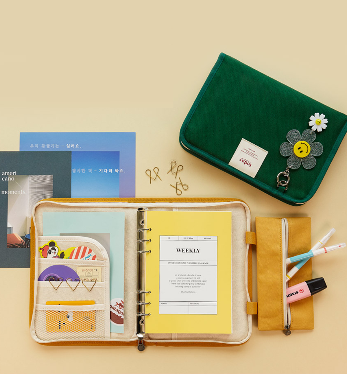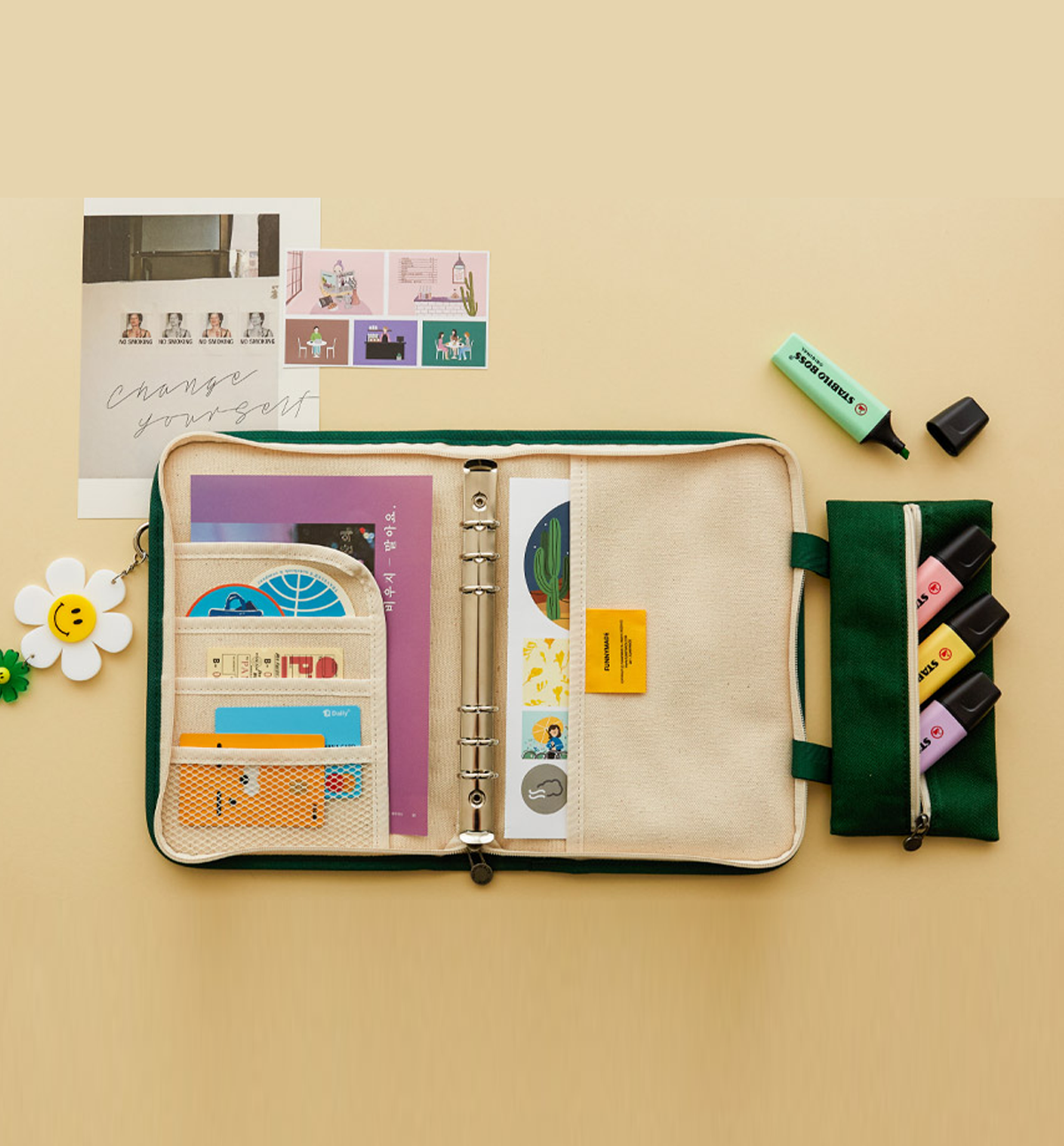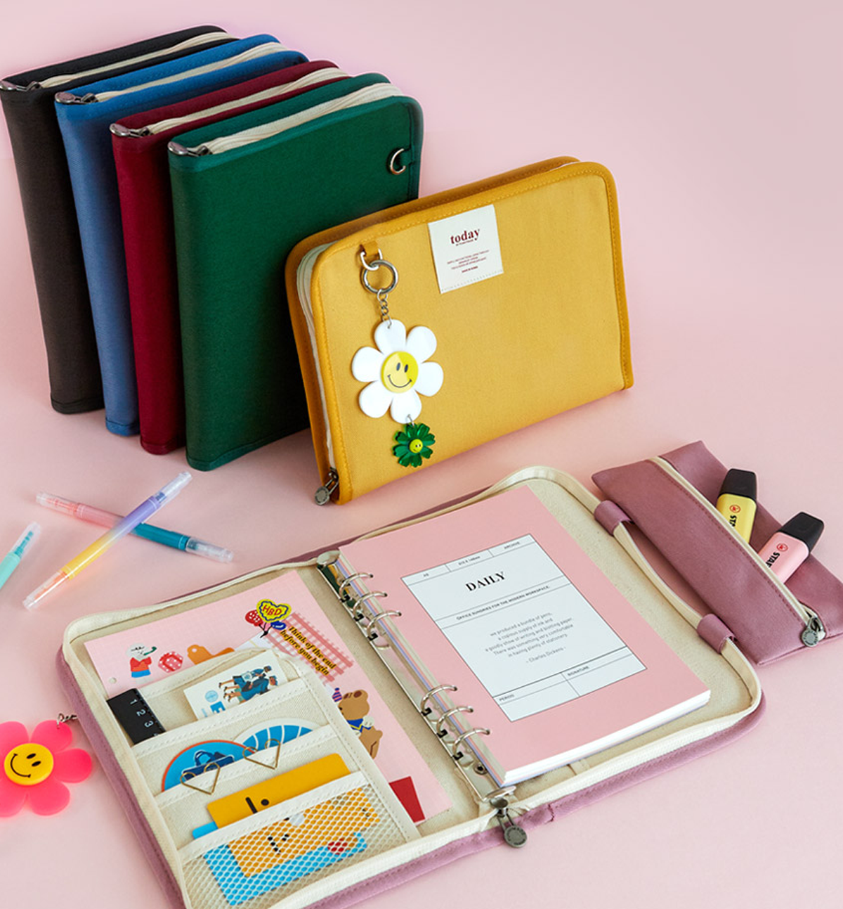 This listing is only for A5 Binder Canvas Cover and the pencil case [as it shows in the pictures]. No bookmark, no tassel, no keyring, no inside refills included, nor any the accessories included.