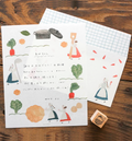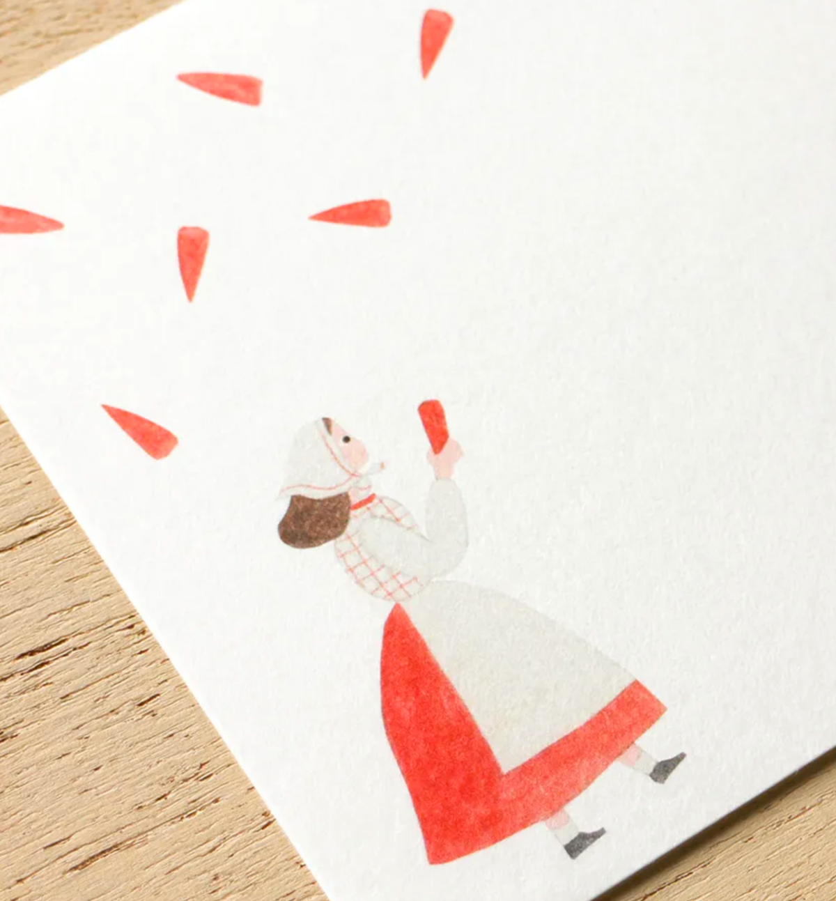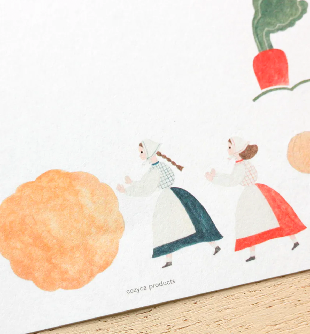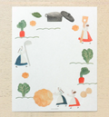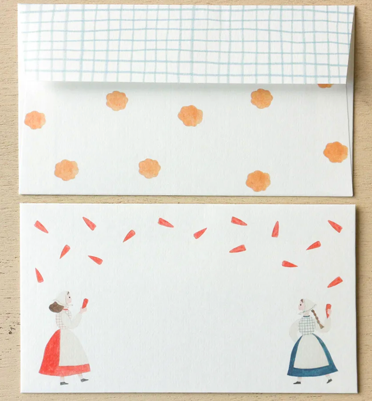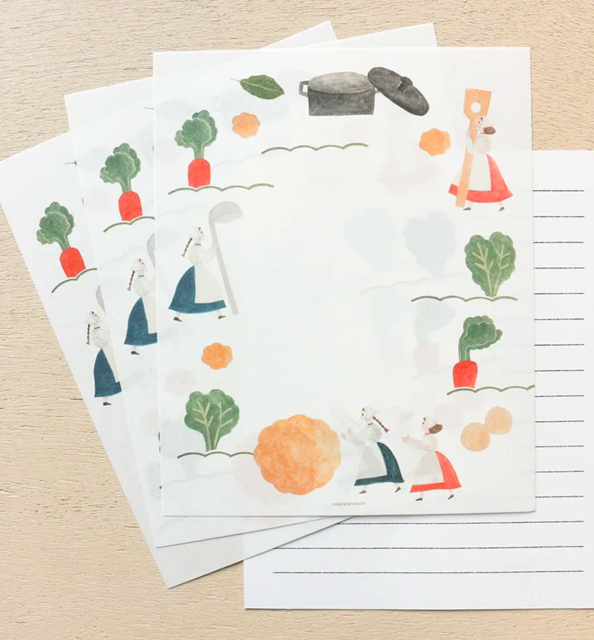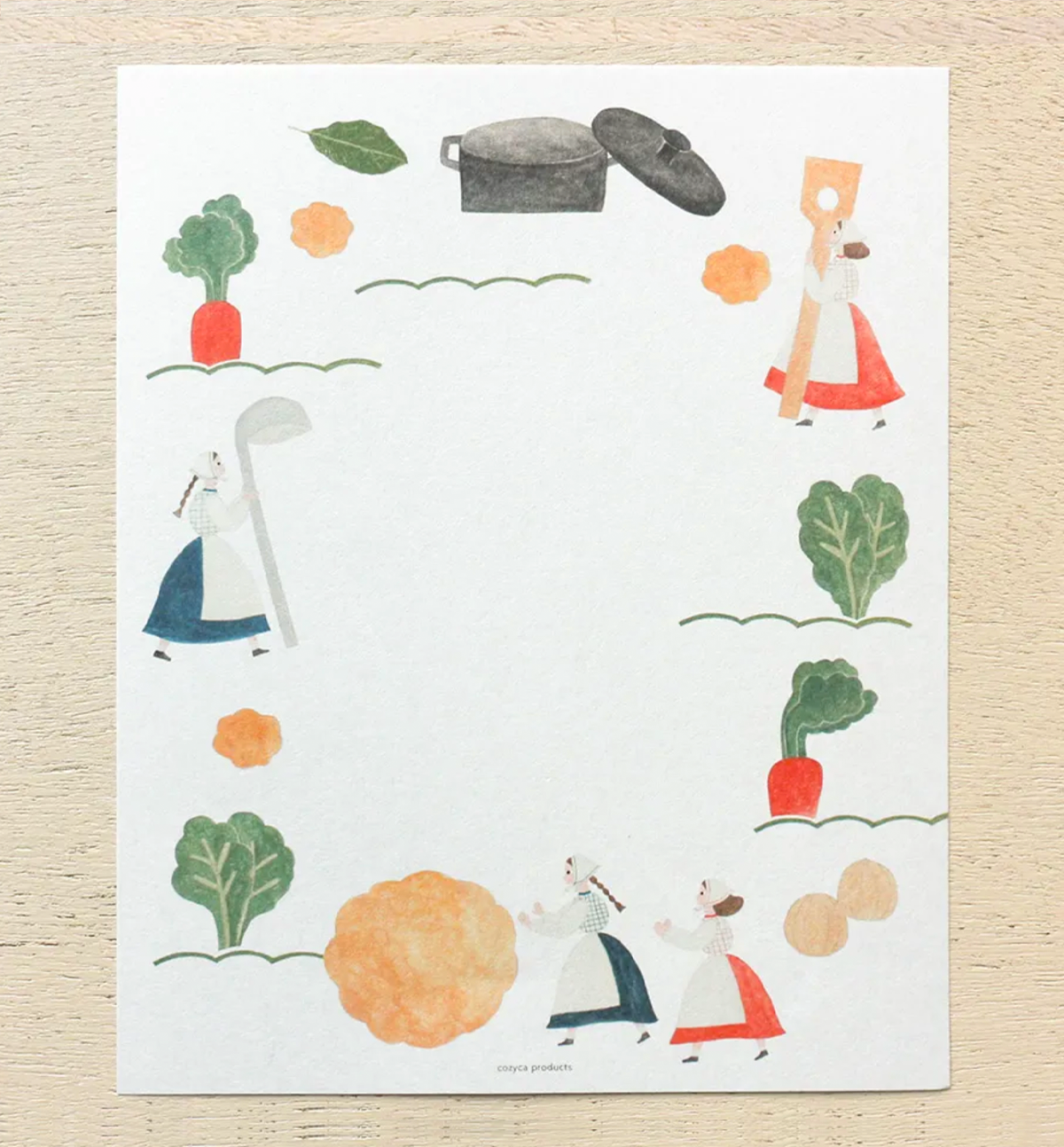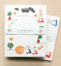 A charming letter set designed by the illustrator unit Necktie. The two girls are wearing matching aprons and seem to be making some kind of soup. What kind of soup will you make by putting carrots and potatoes?  Pot-au-feu, perhaps? The humorous illustrations are irresistibly cute.