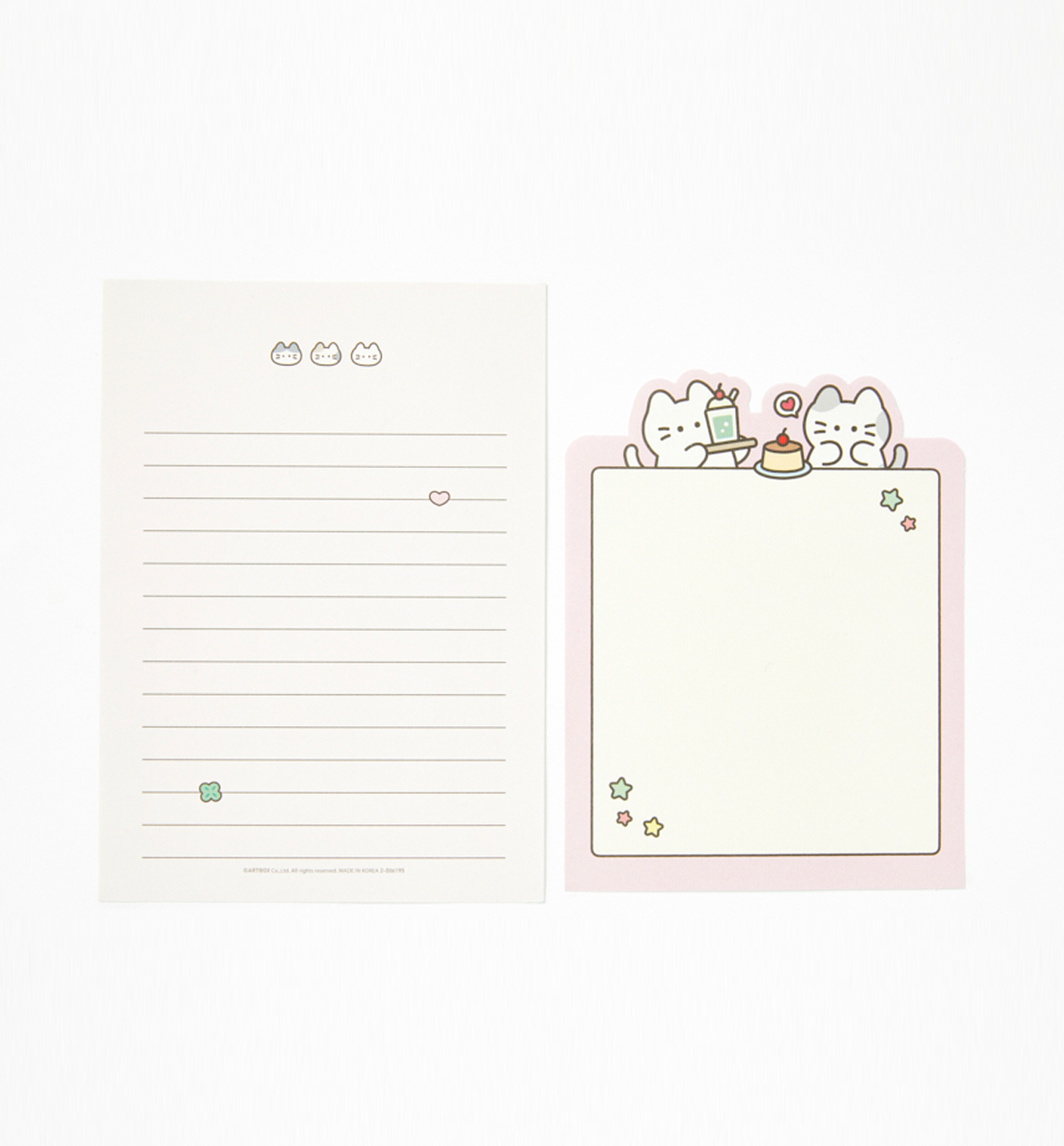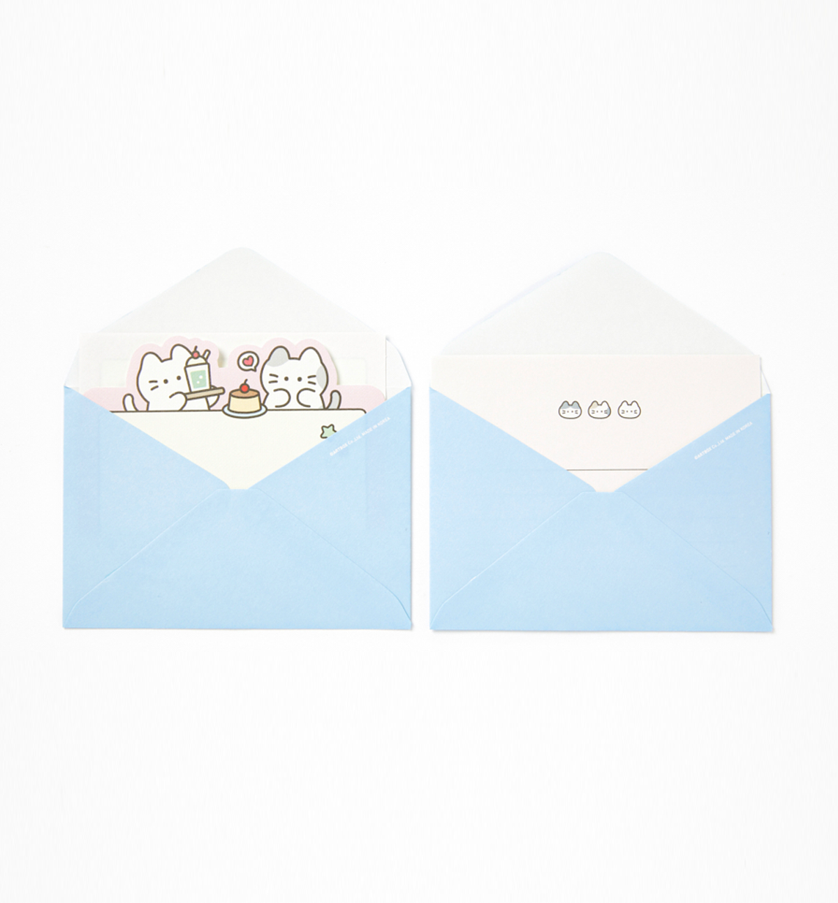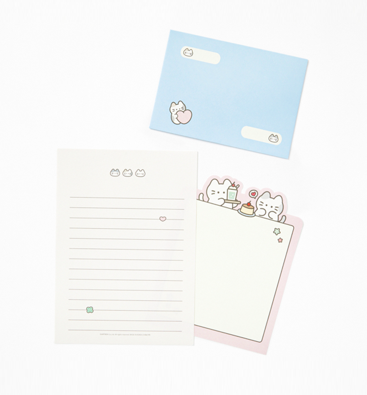 This is a letter set that includes 6 letter sheets and 3 envelopes, all with a cute cat theme. It comes with 4 regular sheets featuring three adorable cats as the main point, and 2 domed sheets illustrated with cats enjoying sweet desserts — giving you a total of 6 sheets to use generously.