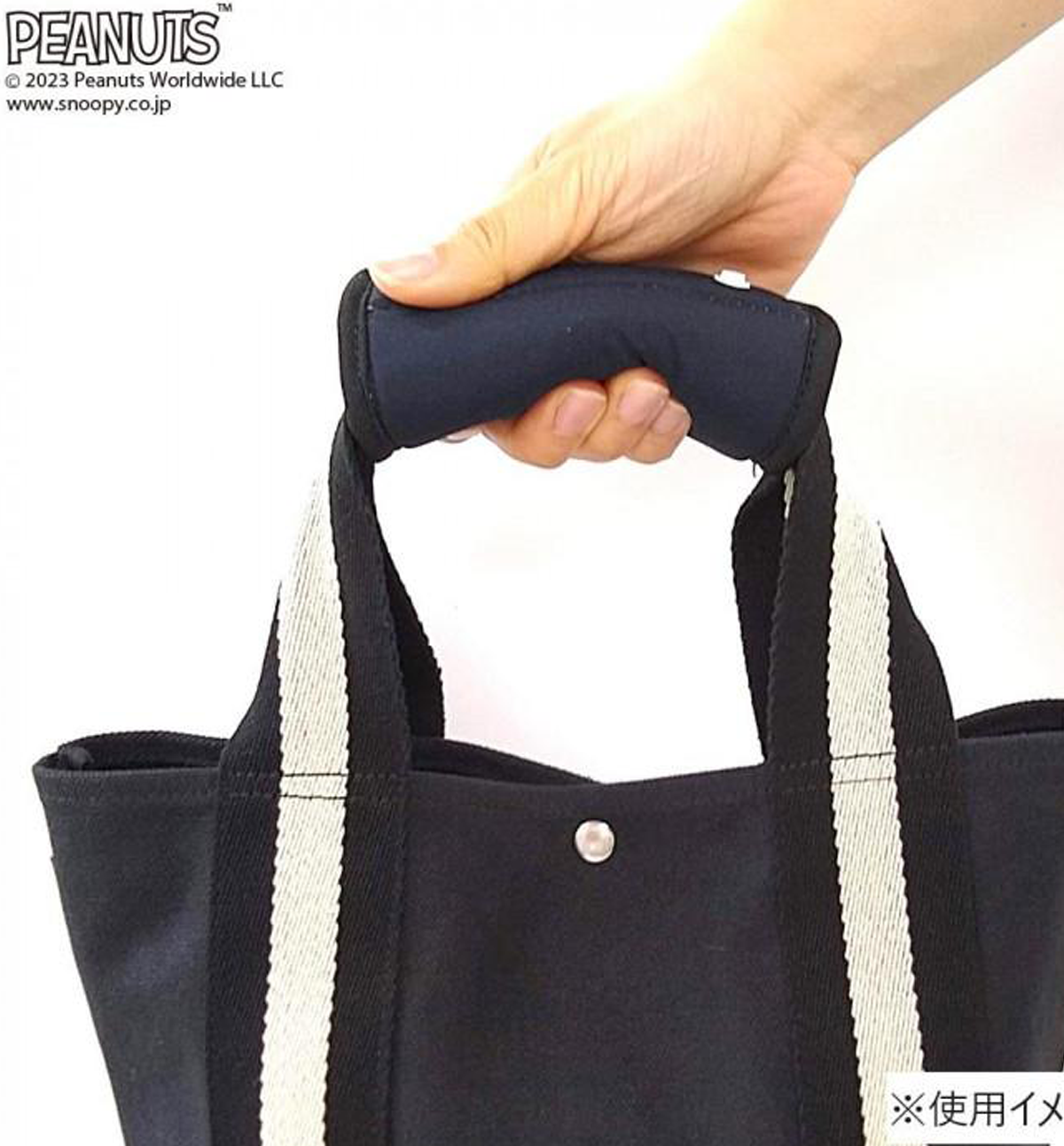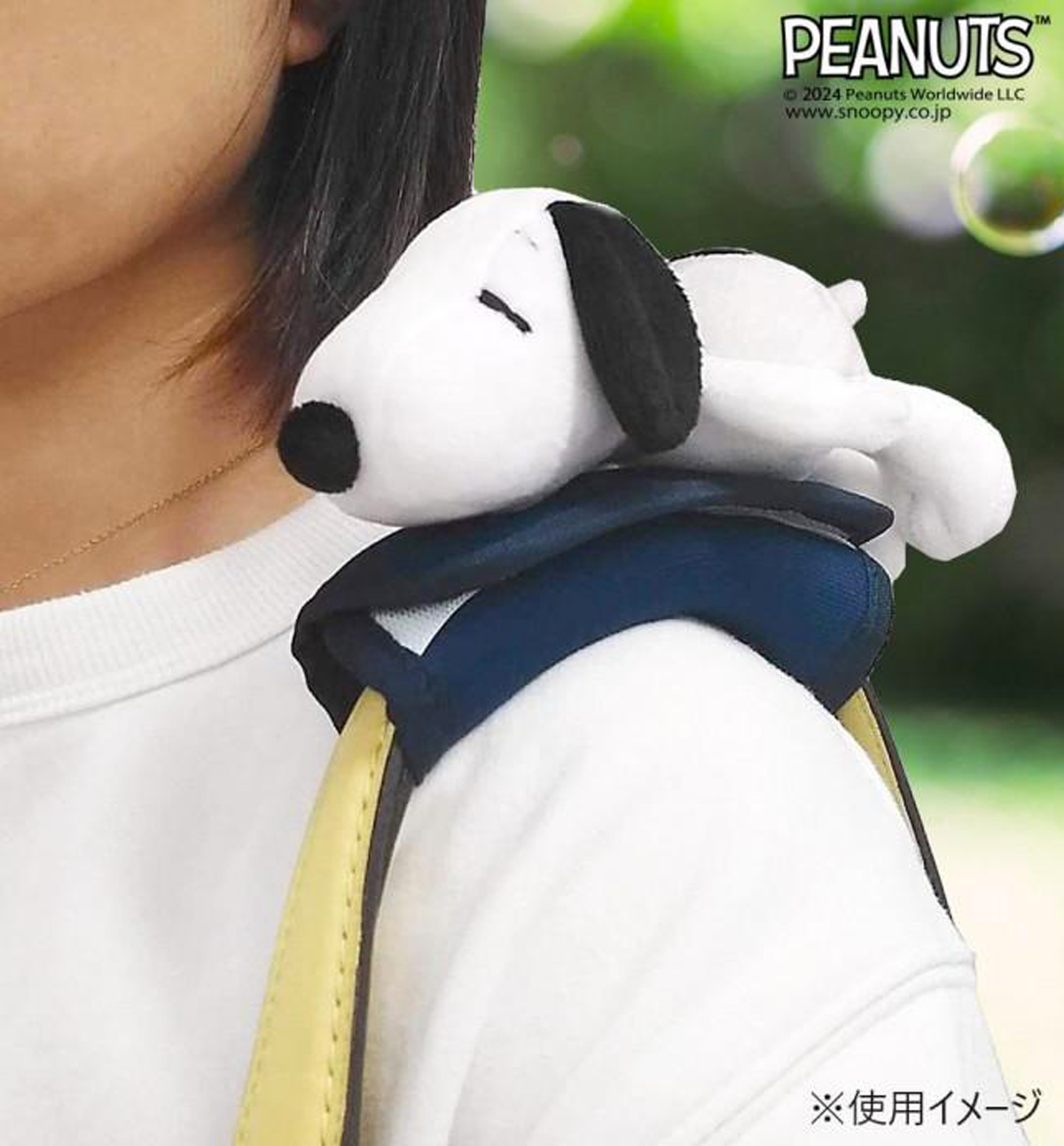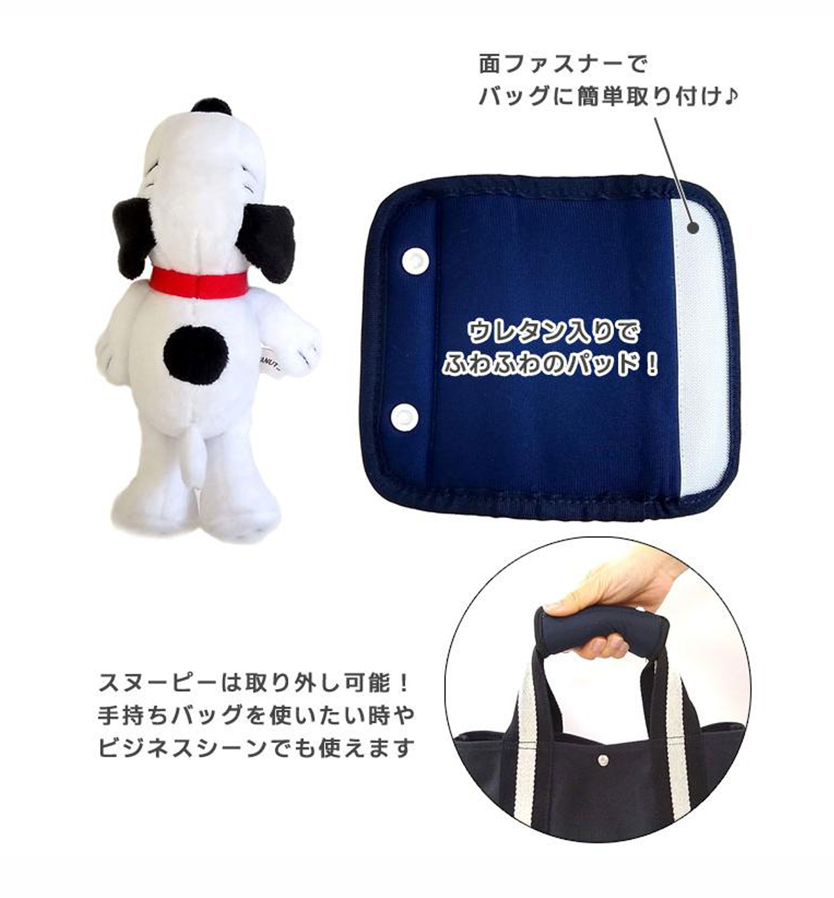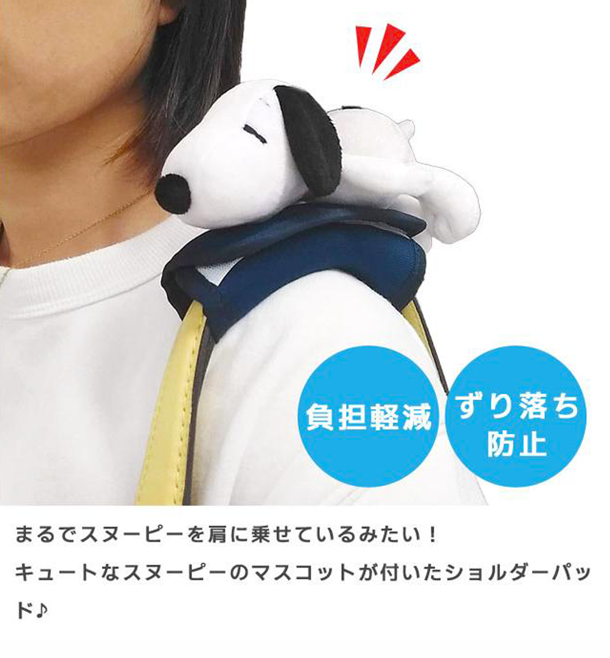 This shoulder pad contains urethane. It relieves the strain on your shoulders and arms caused by carrying heavy luggage. By combining the handles of your bag into one, it becomes easier to carry. It can be easily attached with a hook-and-loop fastener. When carrying the bag by hand, you can remove Snoopy and use the shoulder pad by itself.