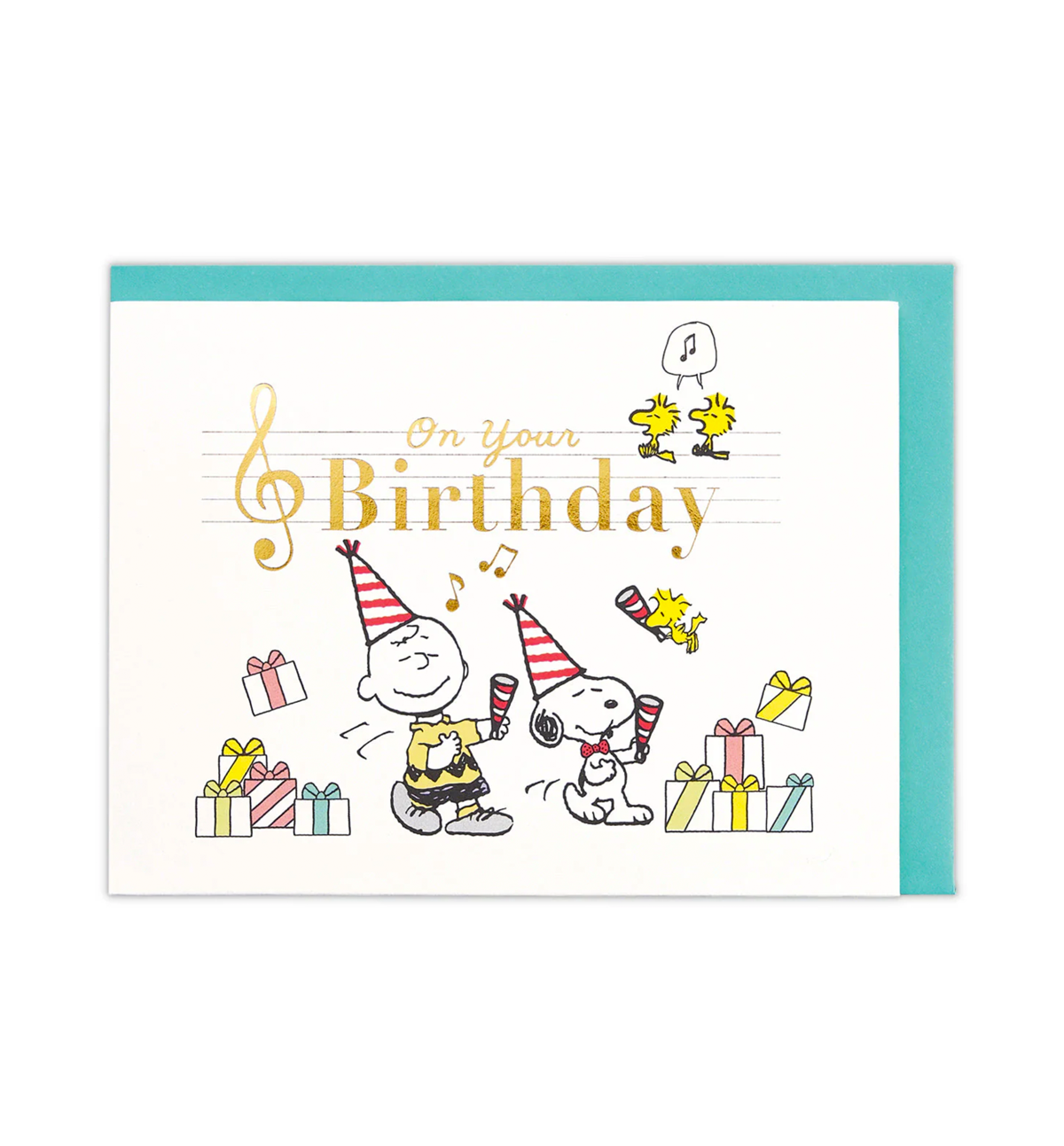 Snoopy's Birthday card where you can almost hear the light cracker sound. Snoopy and his friends will be celebrating your birthday with crackers! The design evokes a fun and lively party atmosphere.
