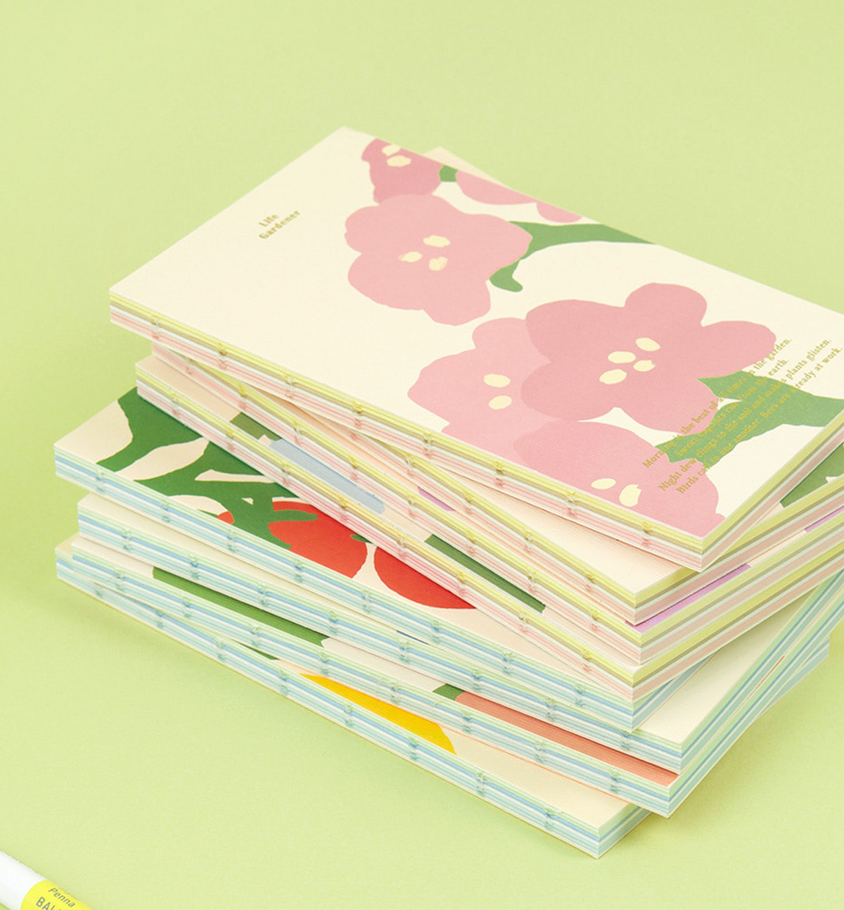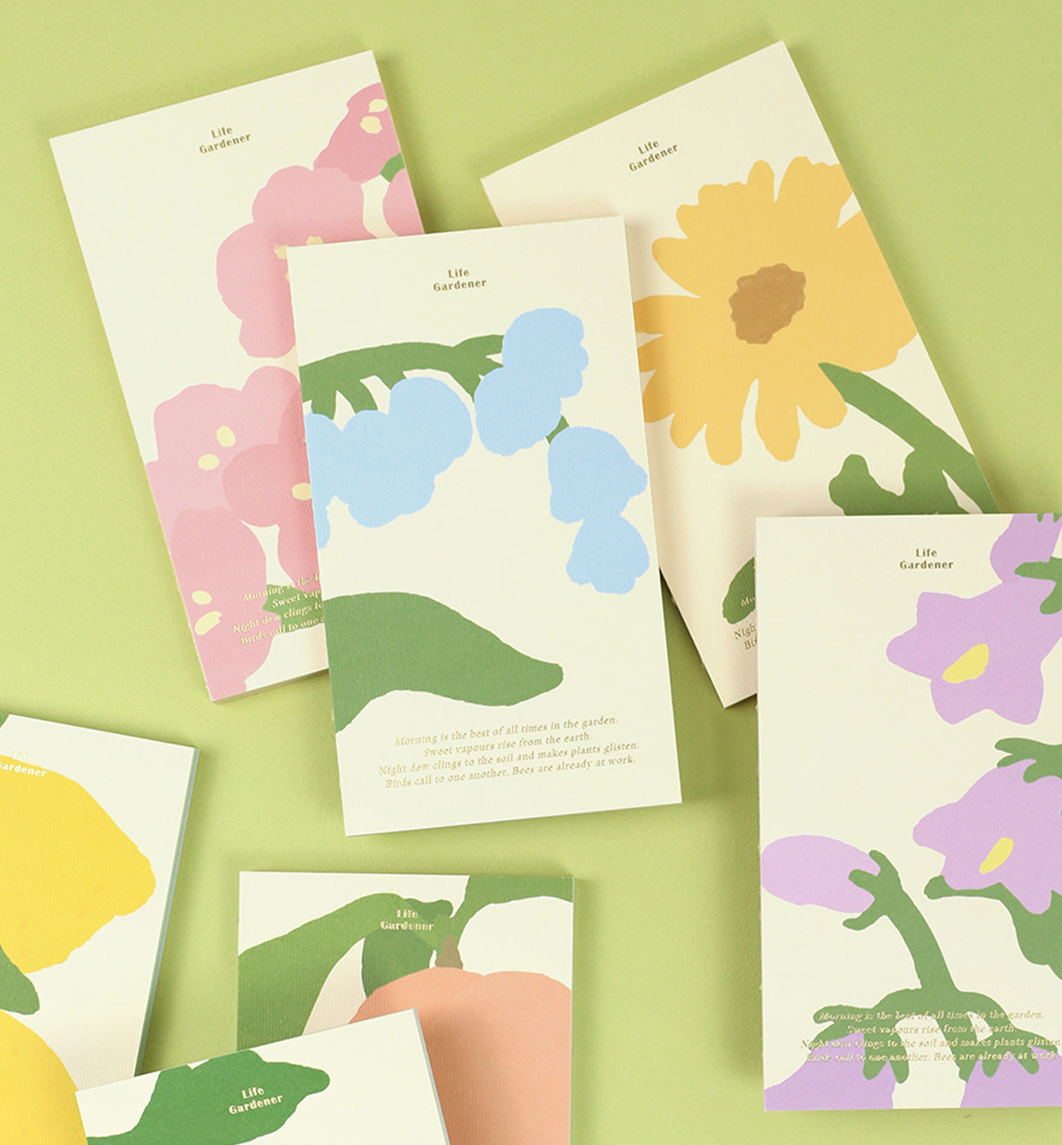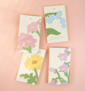 Stack of colorful greeting cards with floral designs on a green background