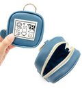 A pouch with cute patches. The patches are rapier woven, and the pull tab and back logo are embossed on PU variable faux leather fabric.