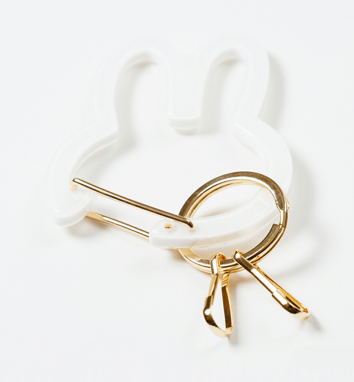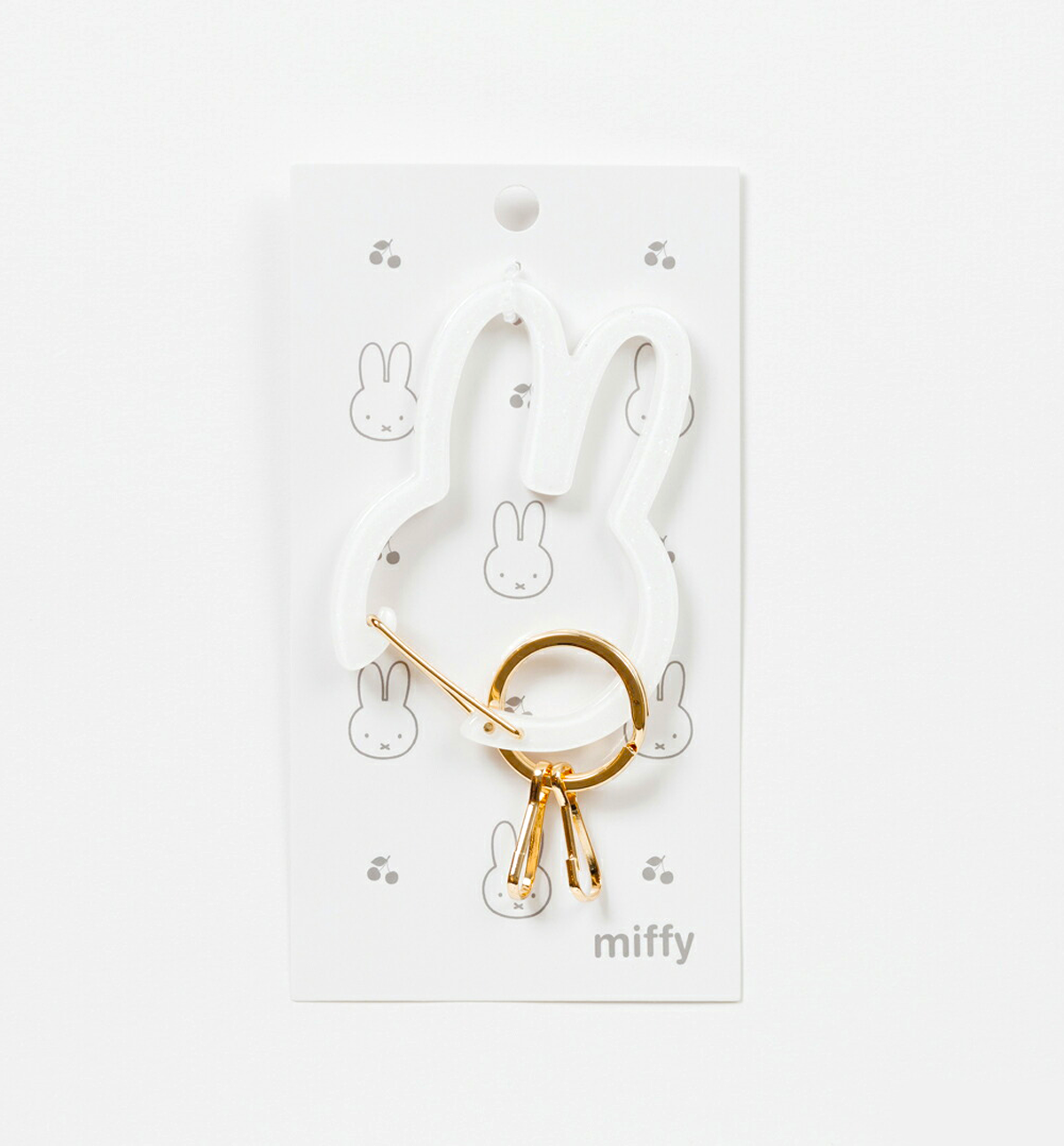 This carabiner is a made of glittery acrylic material and features the silhouette of Miffy's face. It has a double ring and three carabiner hooks, so you can attach keys and charms.