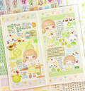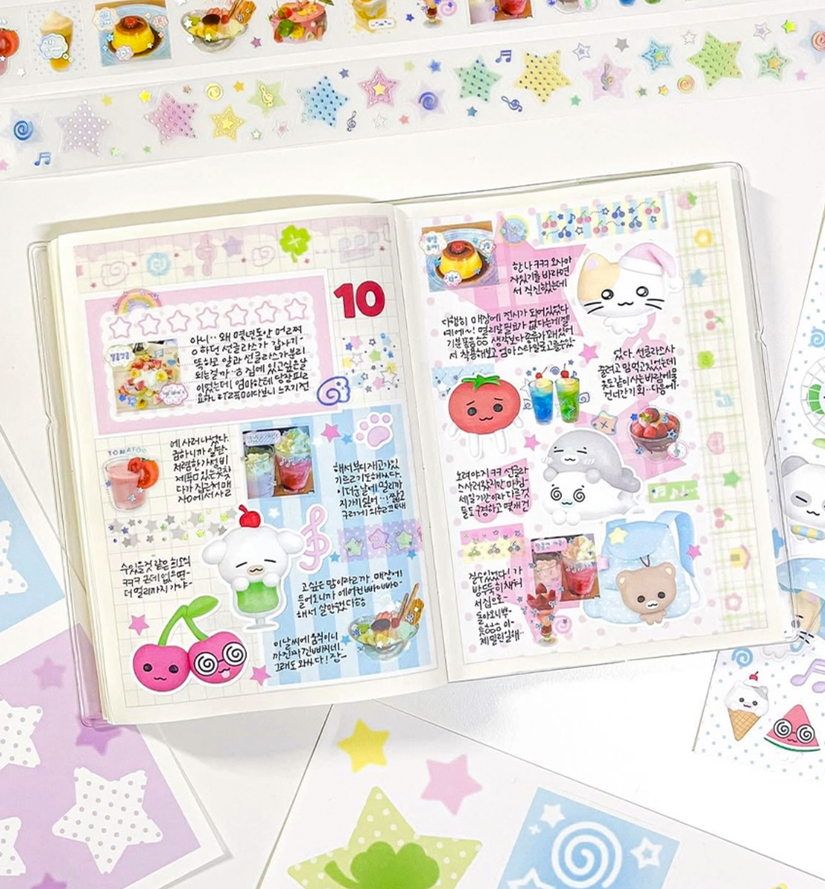 A versatile sticker set featuring layout elements and patterned designs with cute graphics. Perfect for diaries, scrapbooks, and DIY projects. Easy to write on, they add depth and charm to any page.