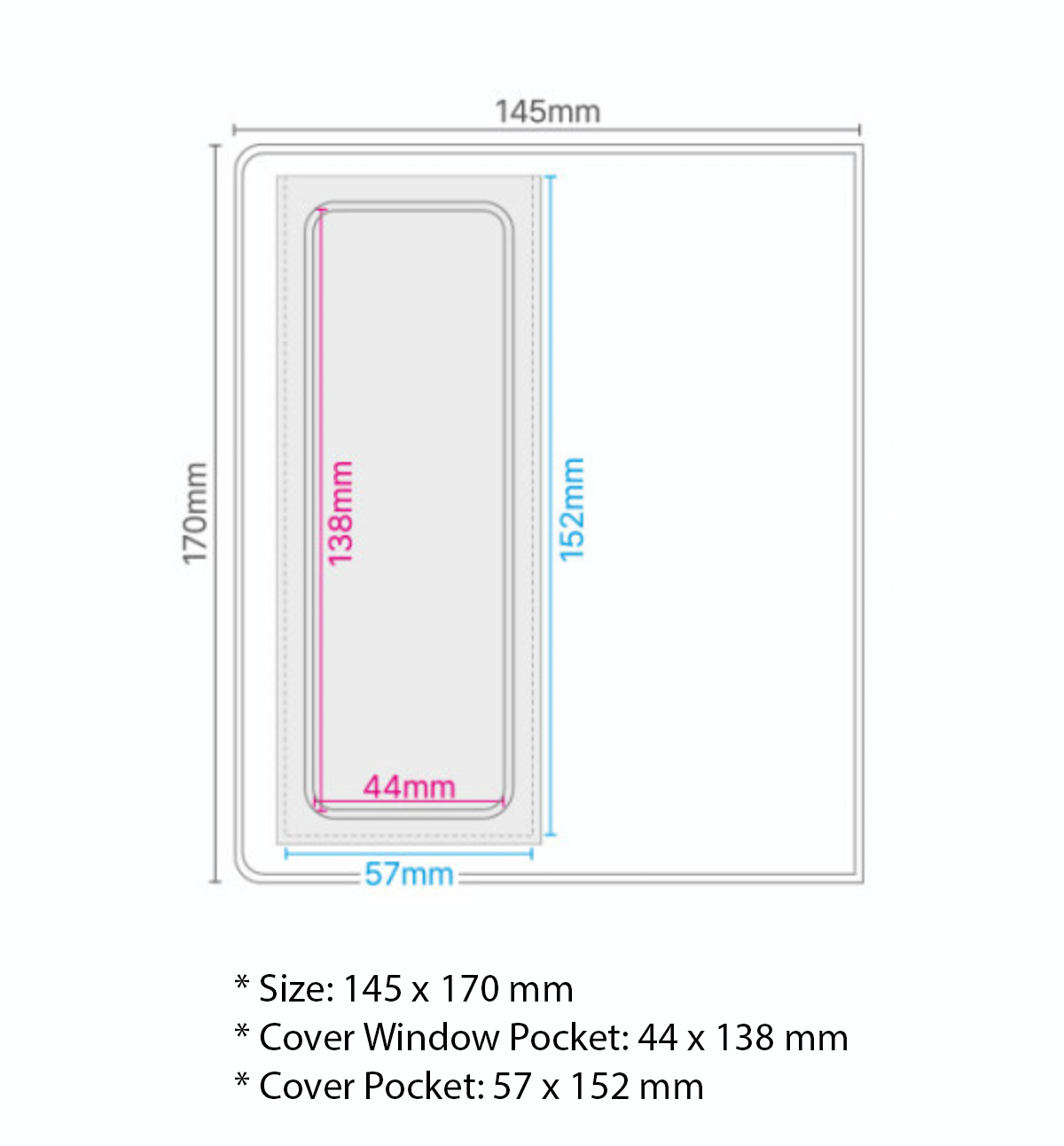 - Cover Window Pocket: 44 x 138 mm