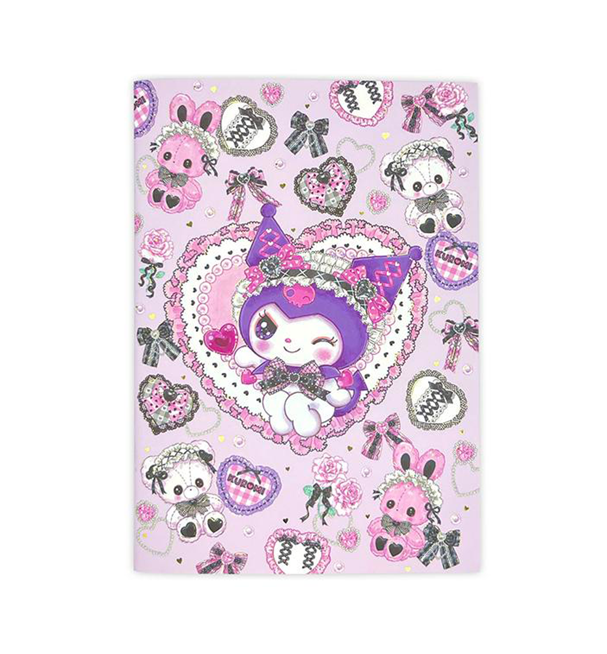 This beautiful Sanrio × Amenomori Fumika A5 Notebook [Kuromi / Lolita Sweetheart] it has gold foil accent on the front cover.