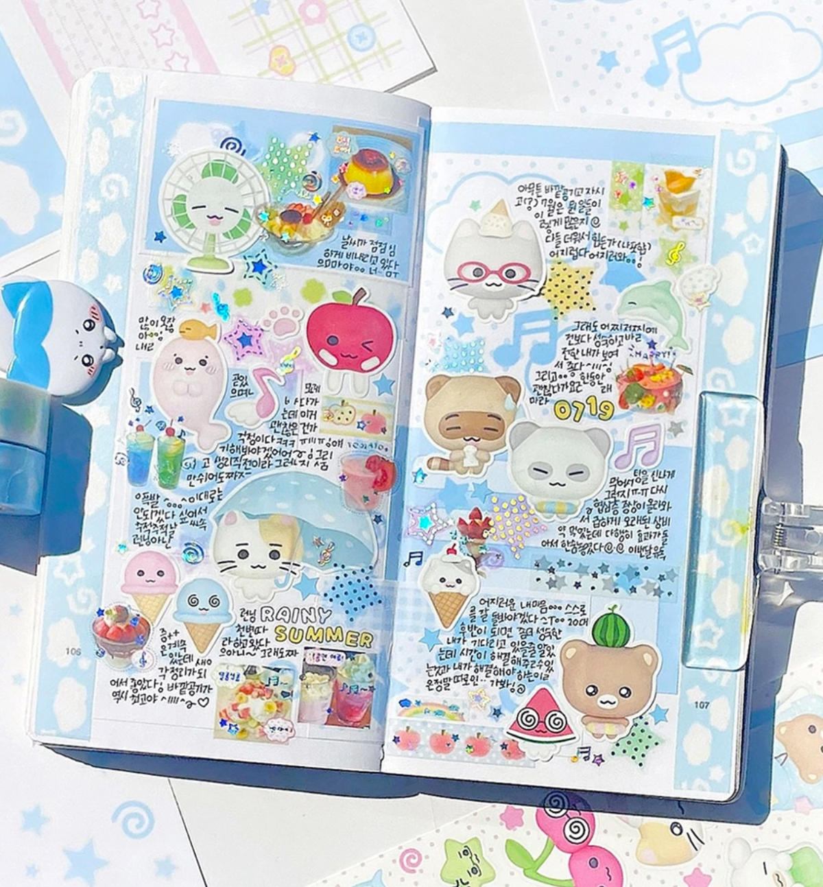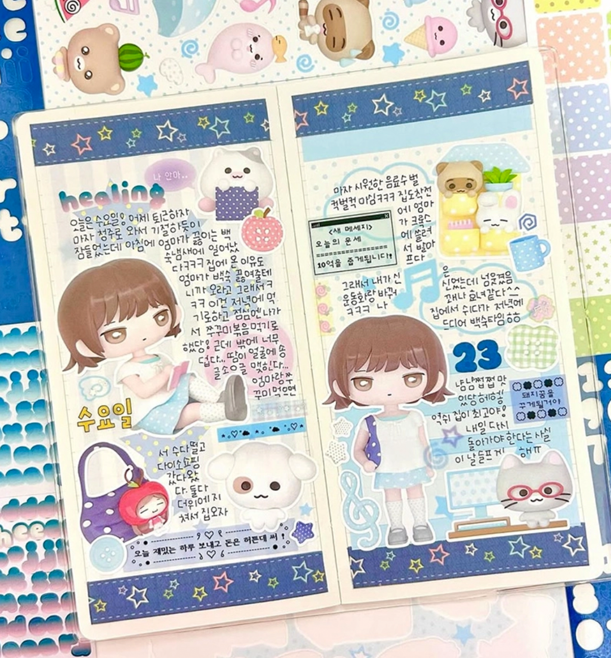 A versatile sticker set featuring layout elements and patterned designs with cute graphics. Perfect for diaries, scrapbooks, and DIY projects. Easy to write on, they add depth and charm to any page.