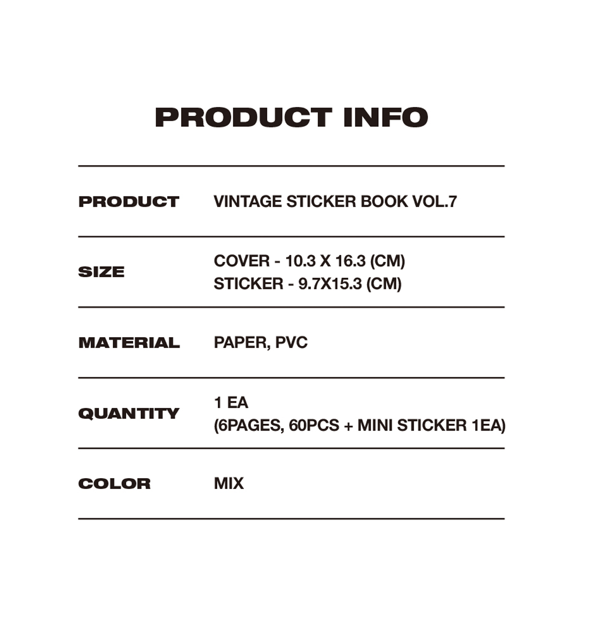 This beautiful Vintage Sticker Book Vol. 7 consists of collages, photos, speech bubbles and line stickers that can be used anywhere. A total of 6 pages, 60 stickers and 1 mini sticker, can be used in various ways.